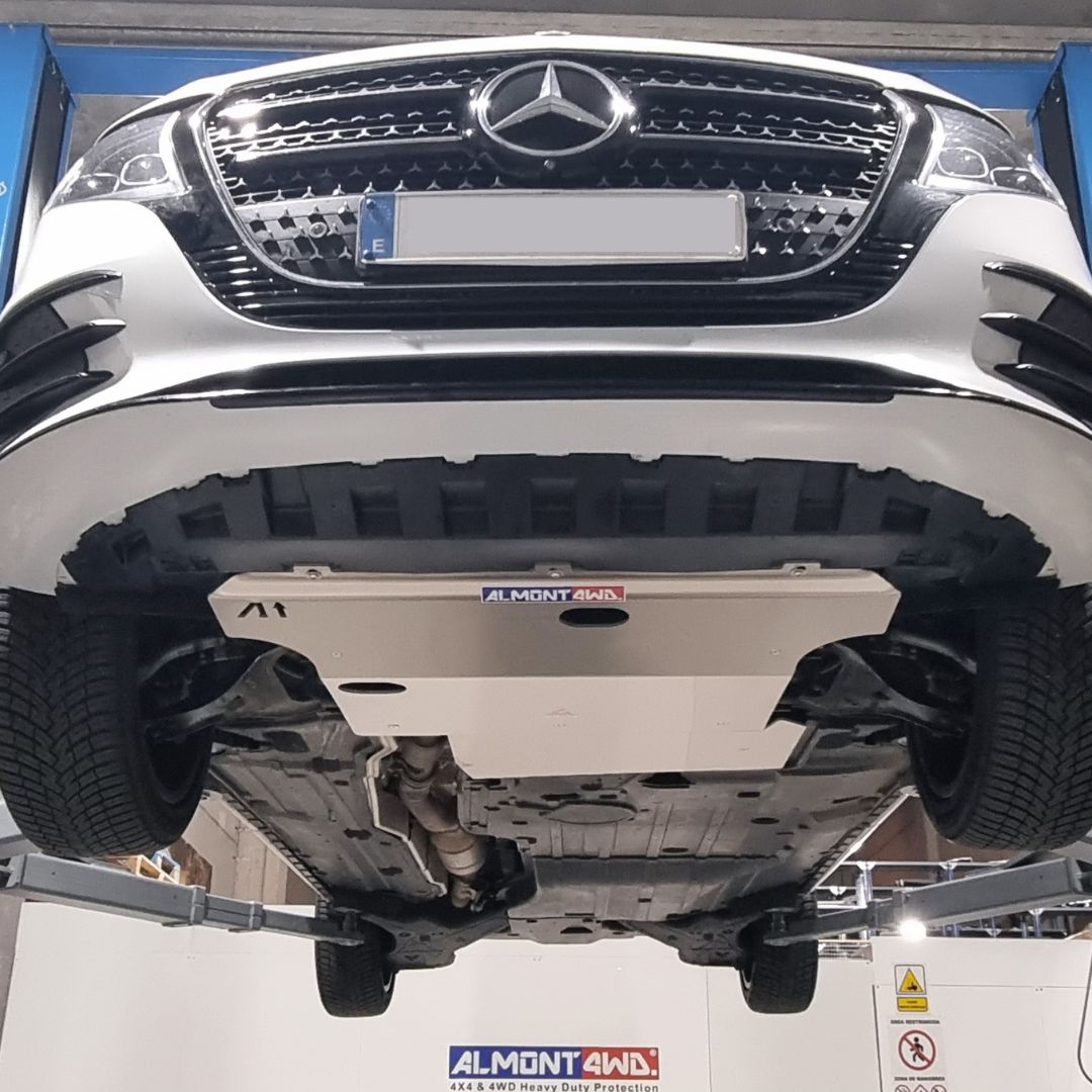 Frontal and transfer skid plate for Mercedes Vito 4×4 W447 2020> 9G-Tronic of radiators, water hoses, intercooler, air conditioning condenser, steering box, crankcase and engine oil, starter motor, and manual or automatic gearbox.